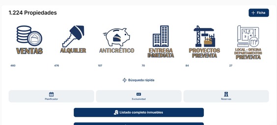 Tenemos un amplio catálogo de propiedades en venta, anticrético, alquiler, así como también proyectos en pre-venta y entrega inmediata, en distintas zonas y presupuestos.